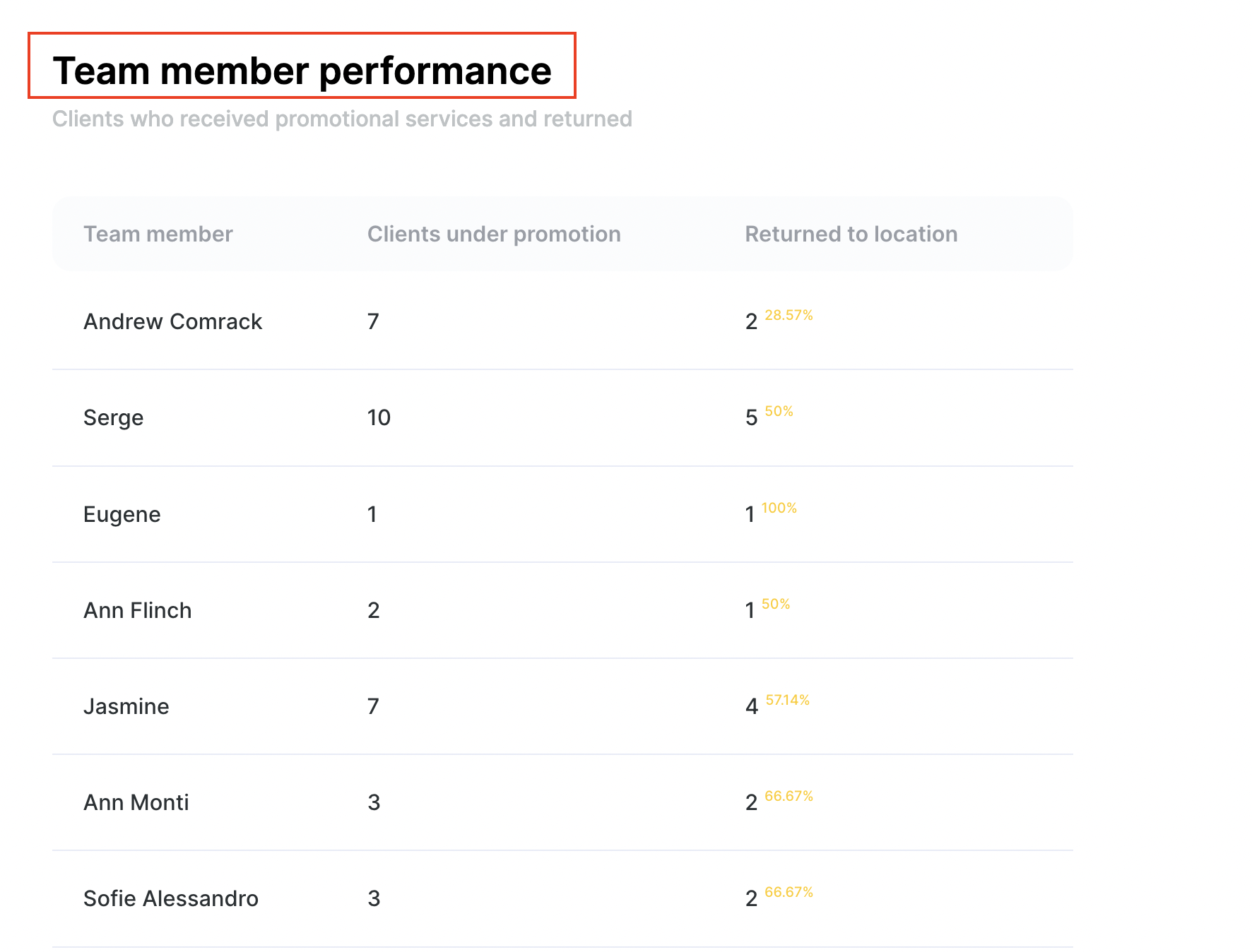 In the Team member performance section you can see information on how many clients received services for the promotion from each professional, and how many of them came to the location again.