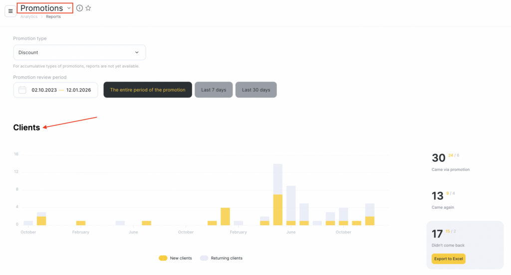 In the Clients section, you will see new and repeat clients who came via the promotion during the selected period.