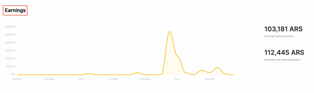 In the Earnings section, you will see revenue from clients who made visits and purchased items using the analyzed promotion, as well as the total revenue these clients generated for the location during any subsequent return visits.