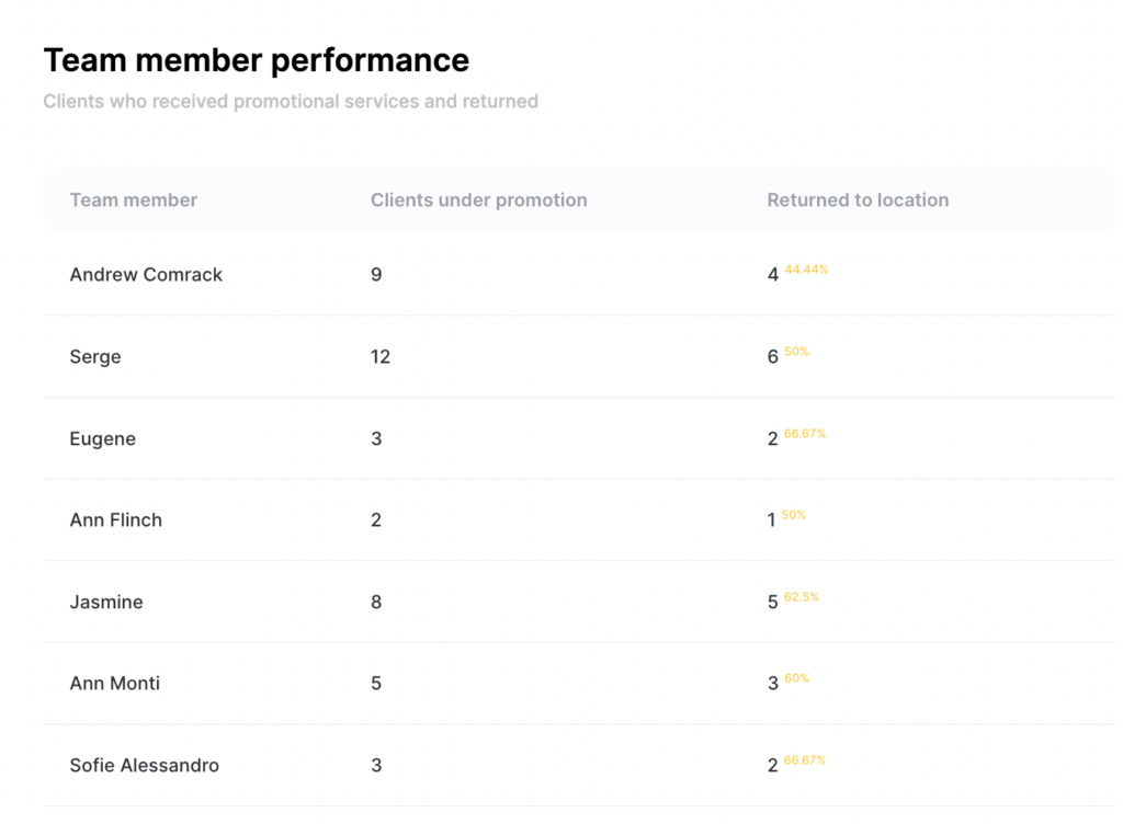 In the Team member effectiveness section, you will see how many clients received services via the promotion from each professional, and how many of those clients returned to the location again.