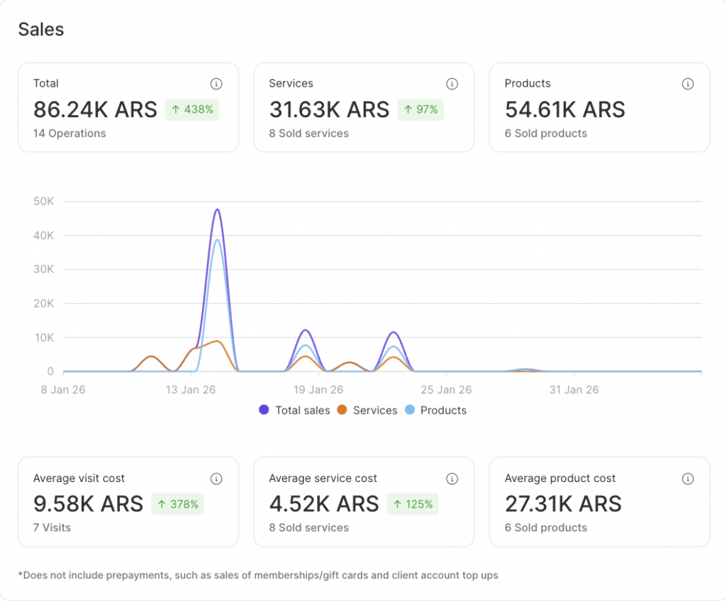 - Clients — number of unique clients who visited during the selected period. If the same client visited multiple times or booked with different team members, they are counted only once.