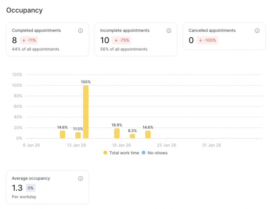 Average occupancy may be calculated incorrectly if the schedule includes team members who do not provide services (for example, administrators) but have working hours set. They have no appointments, but they still appear in the statistics.