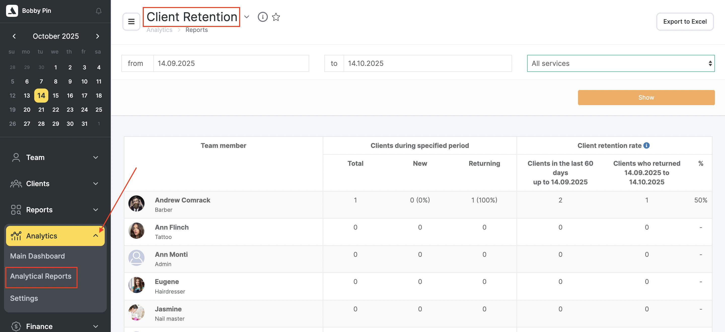 The Client Retention rate shows the percentage of those clients who made visits during a given previous period and returned during the current one (read more about this indicator in the article – Client Retention and Returning clients).