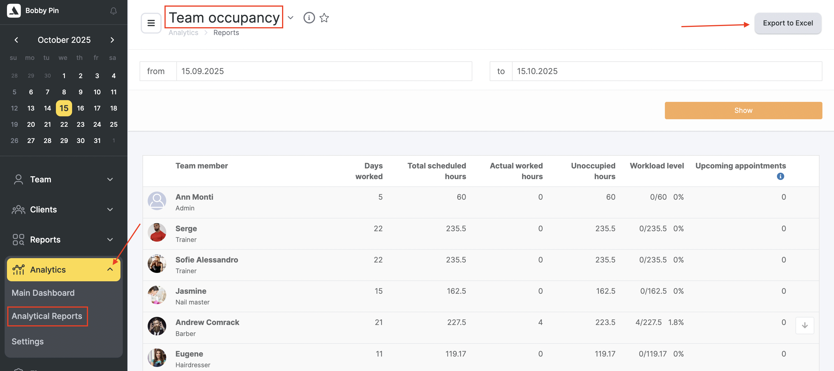 In the Analytics > Analytical Reports > Team Occupancy section, you can see the workload of team members. Specify the period for which you want to see the report and click Show.