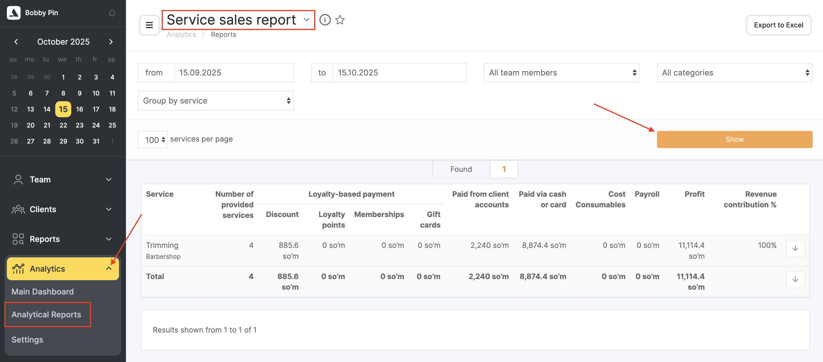 To generate a report, go to the Analytics > Analytical Reports > Sales by Services section. Filter the list by the required items and click the Show button.