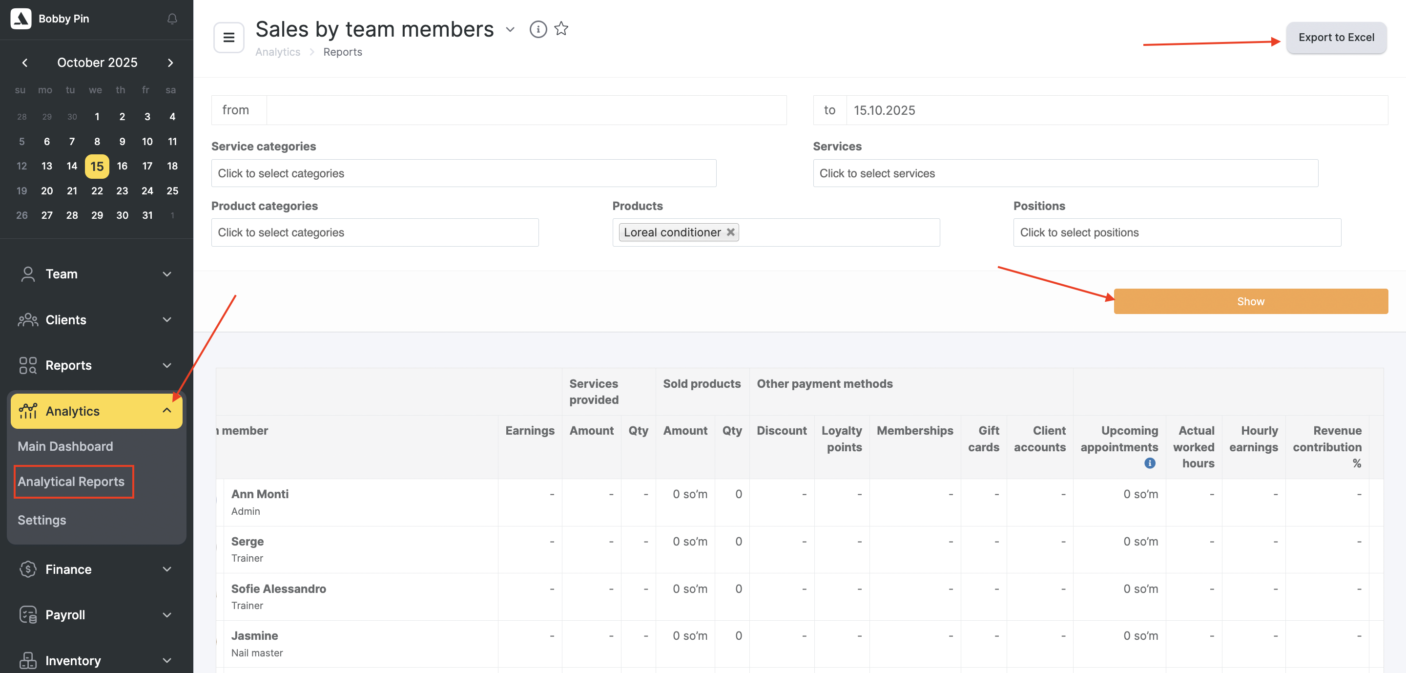 To generate a report, go to the Analytics > Analytical Reports > Sales by Team section. Filter the list by the required items and click the Show button.
