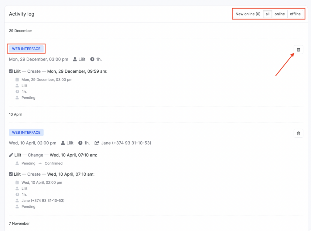 The activity feed shows all created appointments, as well as the history of all changes related to them.