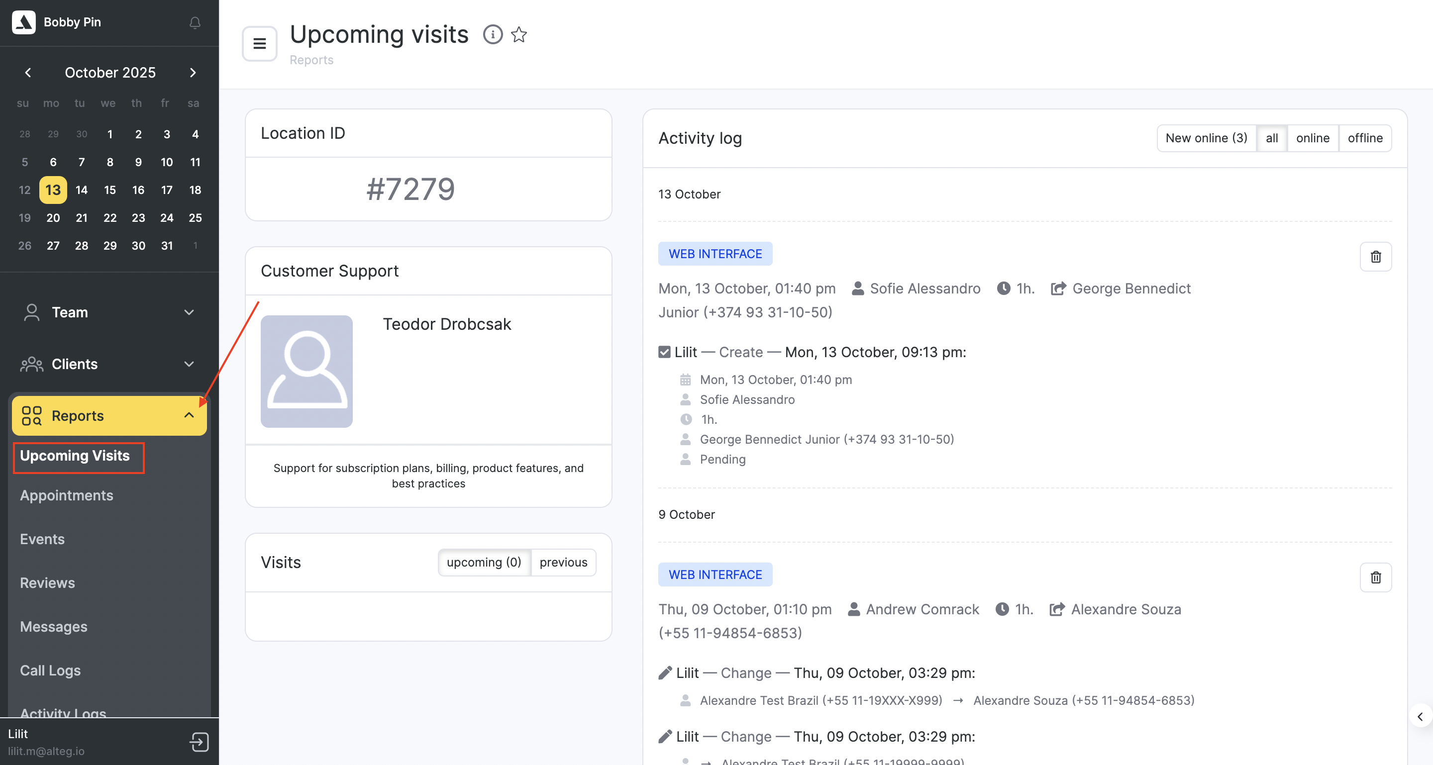 The Reports – Upcoming Visits section contains service information that is necessary when contacting Altegio support, as well as summary information about recent appointments and visits. The content of the sections under the Reports – Upcoming Visits section: