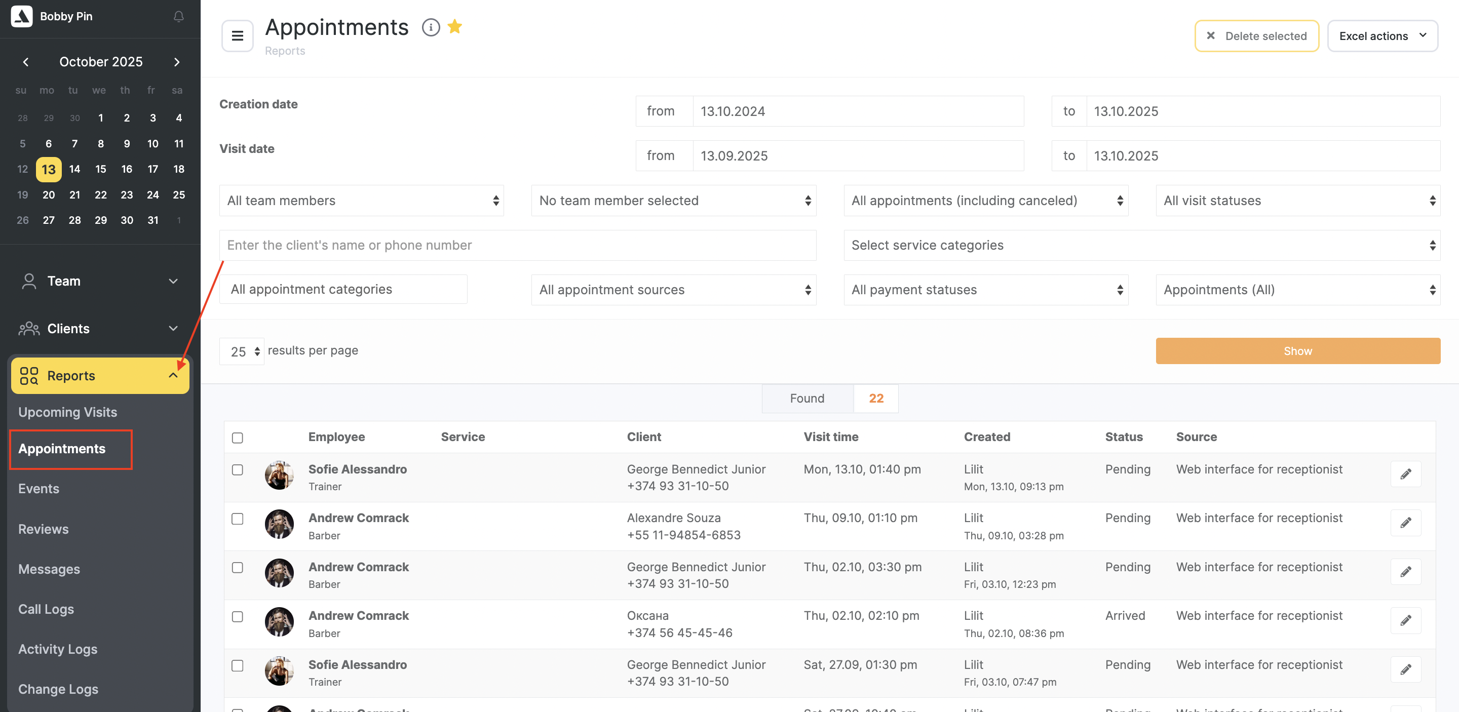Apply the necessary filters and click the “Show” button. You can also search for appointments by a specific client by entering their name or phone number and clicking “Show.” Each appointment can be edited and/or deleted.