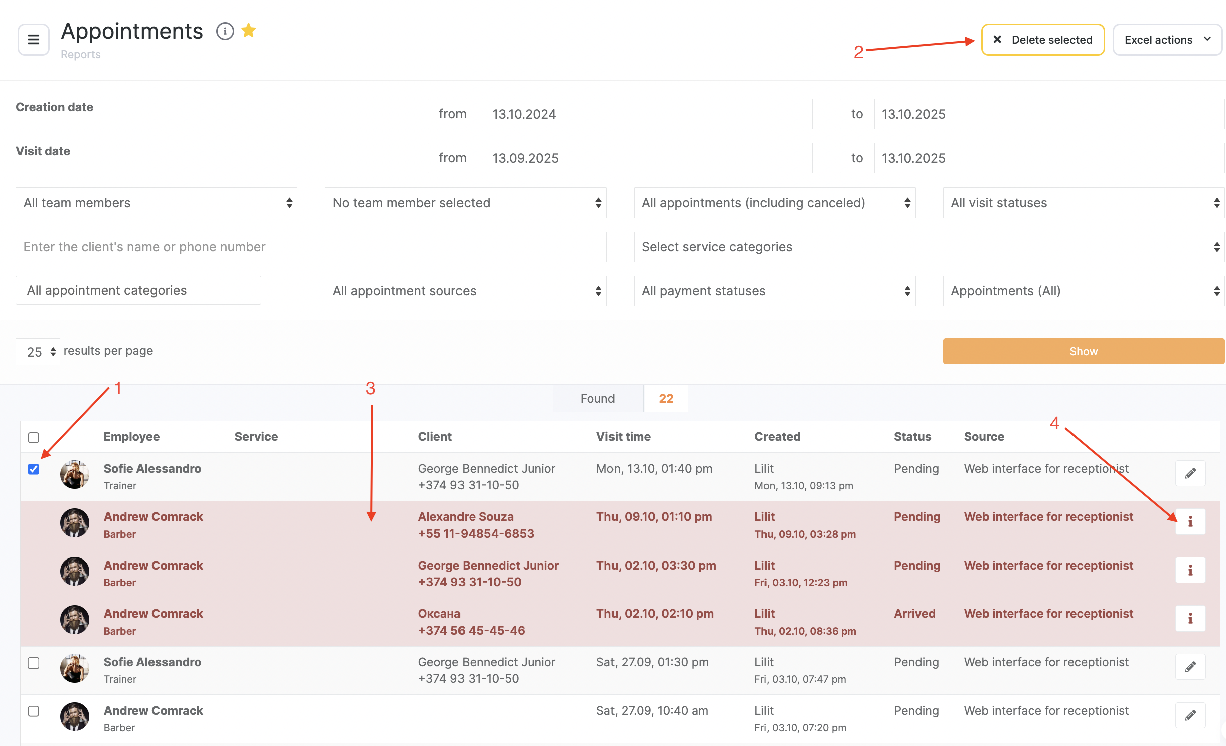 Appointments can be deleted one by one or in bulk. For deleting check the required appointments (1), the Delete selected button will be active (2), click it. The appointments will be deleted from the appointment calendar, and the row with the appointment data will change color to red (3). To see the detailed information about the deleted appointment, click Info button (4).