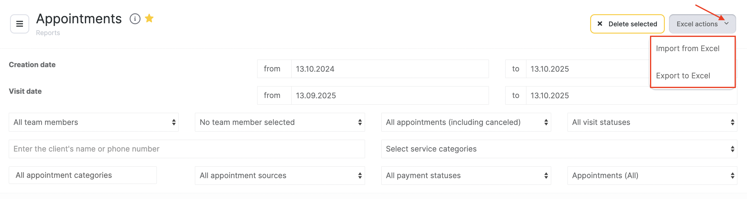 - Go to Reports > Appointments, click “Excel actions”, then select “Import from Excel”
