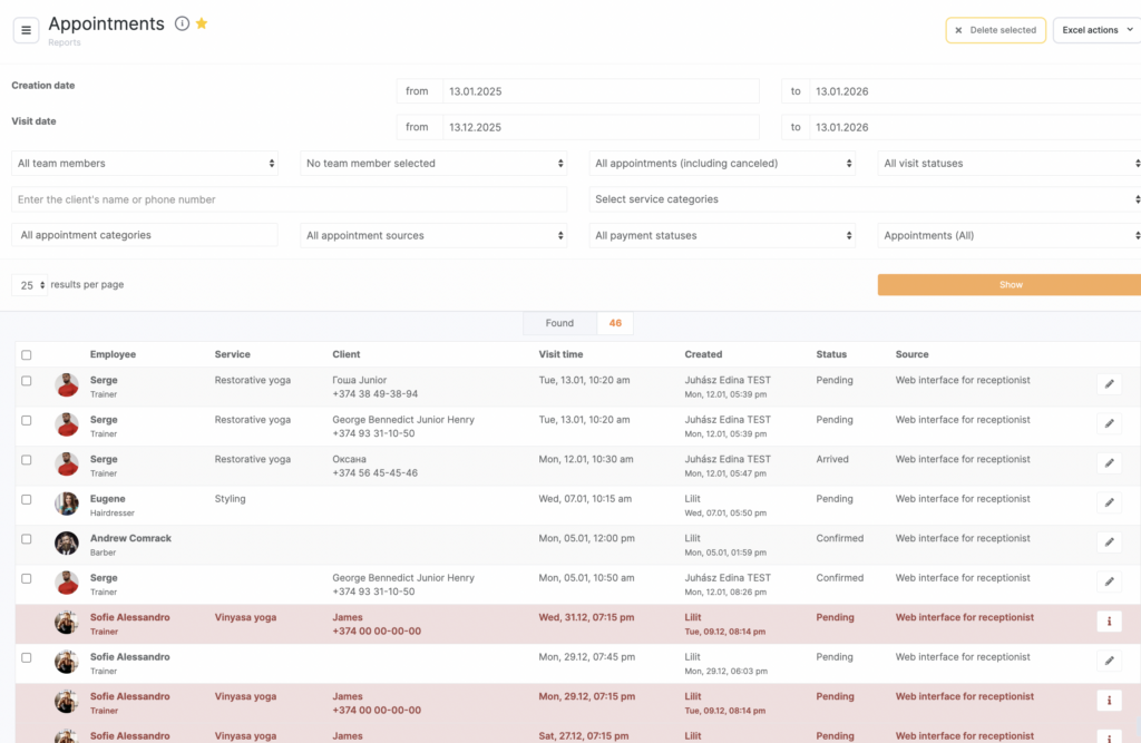 This section provides information about which appointments were made and during what period, who created them (receptionist or client), the source of the online booking, assigned team member, booked service, client information, etc.