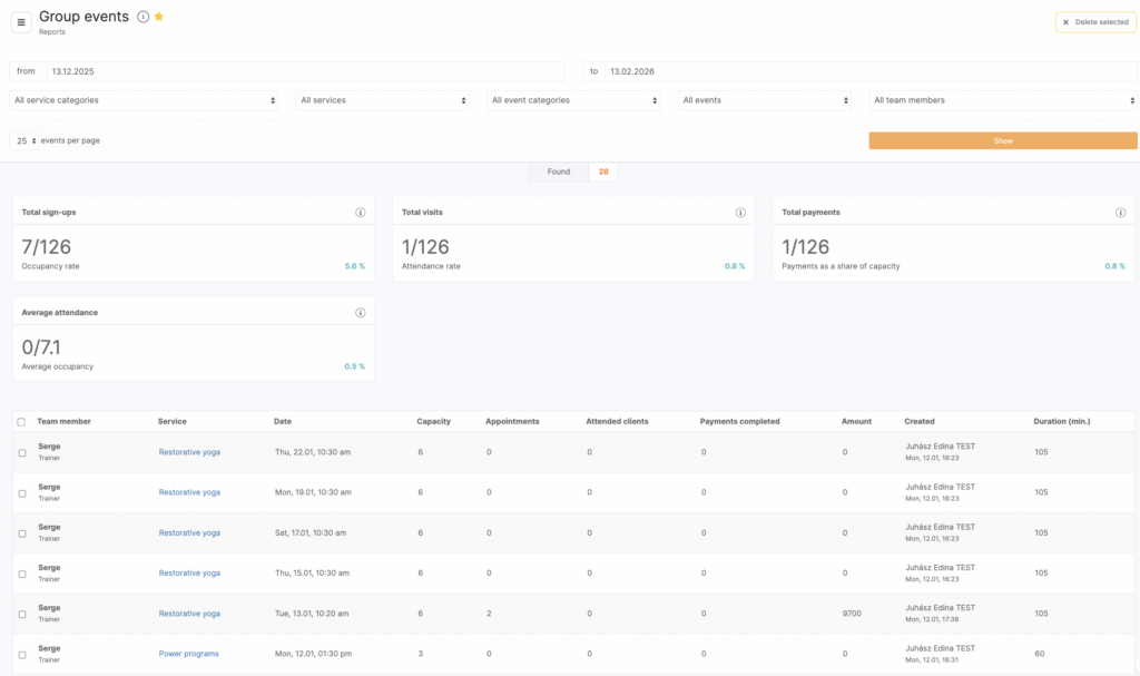 In the Reports > Events section, you can view information on all events (group appointments) created in Altegio. This includes events created by any users who have permission to create appointments, events with any status, and deleted events.