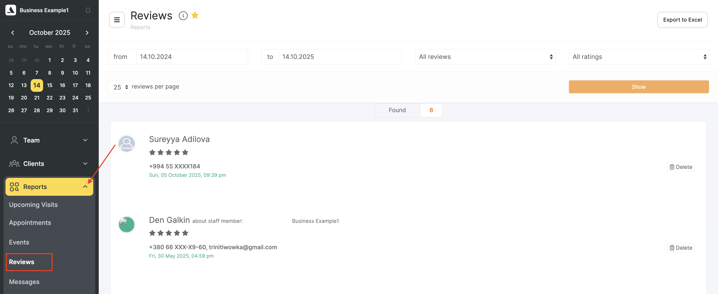 The Reports – Reviews section contains information about all the reviews left by the location’s clients. It includes reviews left both in the description of the company and in the description of professionals.