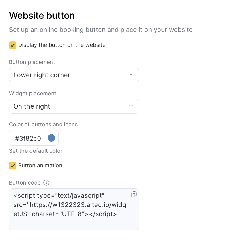 - In the code snippet field, paste the standard button code taken from Online booking → Online booking links. More details on where to find the online booking button code in Altegio are provided below in this article.