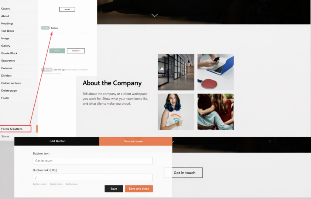 - In the block Content, change the button name to, for example, Book. In the Button link field, enter the # sign.