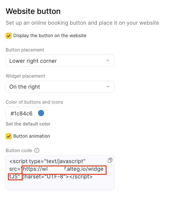 - Where CLASS is the value of the class field from the button code, and link from the Button code menu is the value from the Altegio online booking form (how to find this data is explained below).