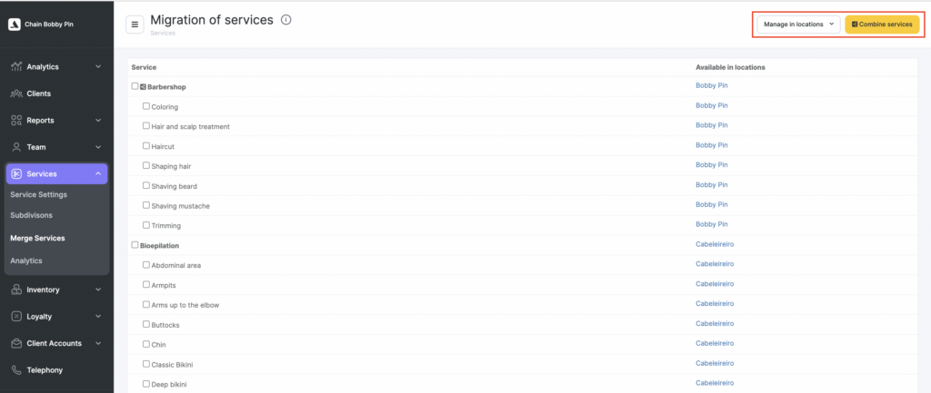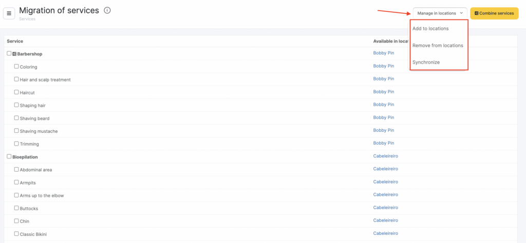 The list of services from all locations, as well as all chain services are displayed in the Services > Merge Services section. Next to each service, there is information about the location where it is available. Chain services are managed using the buttons in the upper right corner: Manage in locations and Combine services.