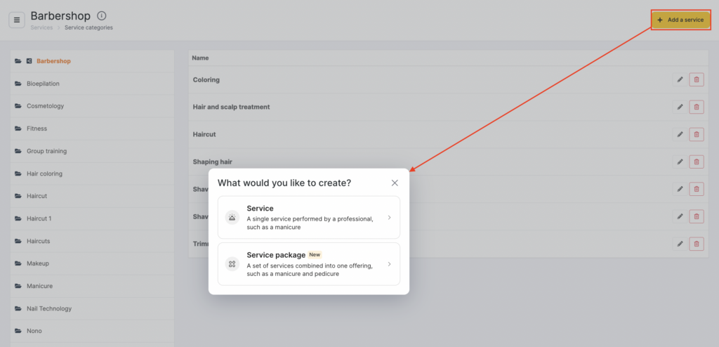 Add services to the category. To do this, click the category name — the Add service buttons will appear. Click any of them.
