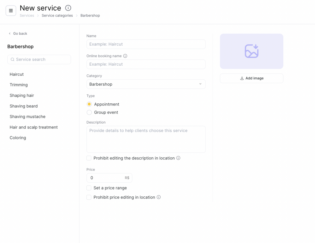Enter the service name and the online booking name (this is the name clients will see during online booking; if you leave the field empty, the main service name will be used). Select the category this service belongs to. Specify whether this service will be available for group booking. Add an image that reflects the service.
