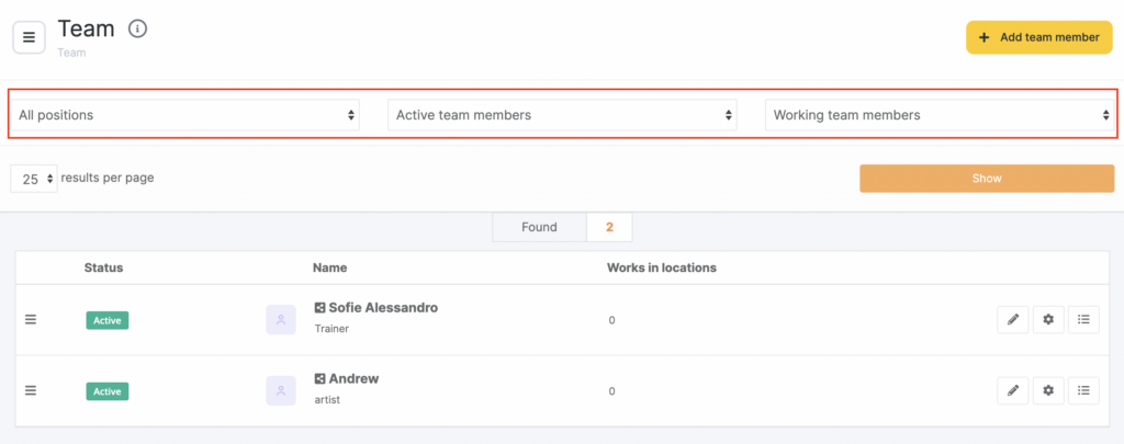 For convenience, you can view team members selectively. To do this, filter the list by Position (read more here) or by Deleted/Active team members, Dismissed/Working team members filters and click the Show button.