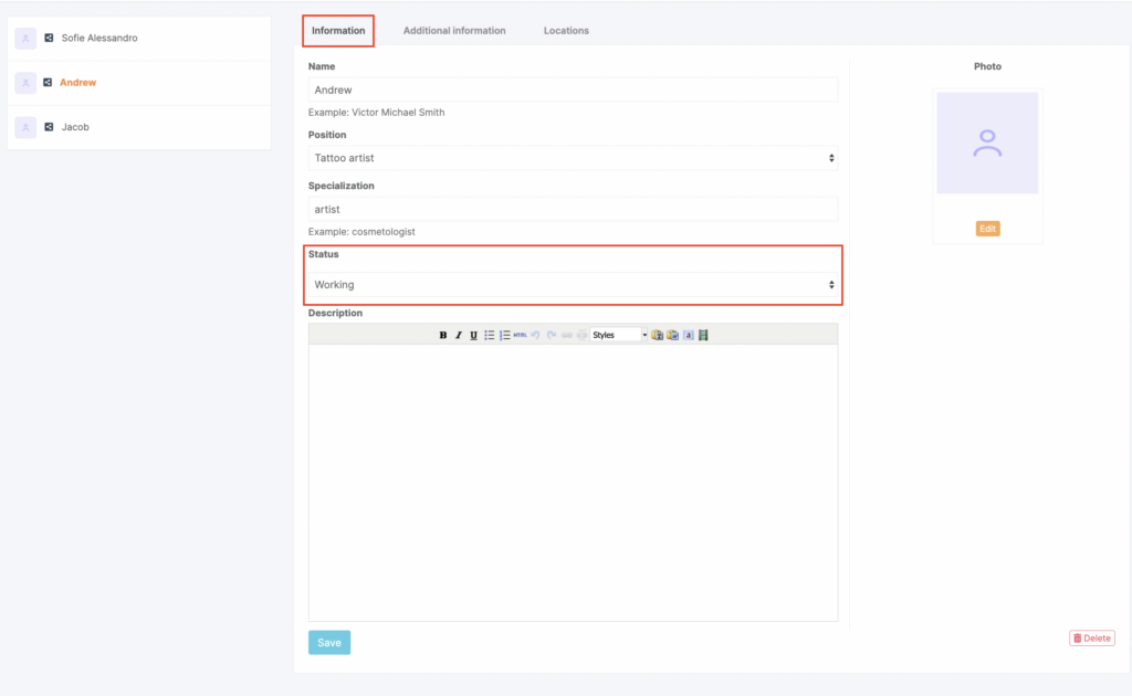 Team members can be dismissed or deleted. To do this, select an team member, click the name or the Edit description and photo button. In the Information tab select the Dismissed status and specify the Date of dismissal if you need to remove a team member from the list, but at the same time save all team member statistics. If you want to delete a team member and all data, click Delete. At the end, be sure to click Save.