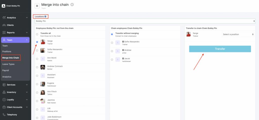 To transfer a team member from a location to the chain, go to the Team > Merge Into Chain section.