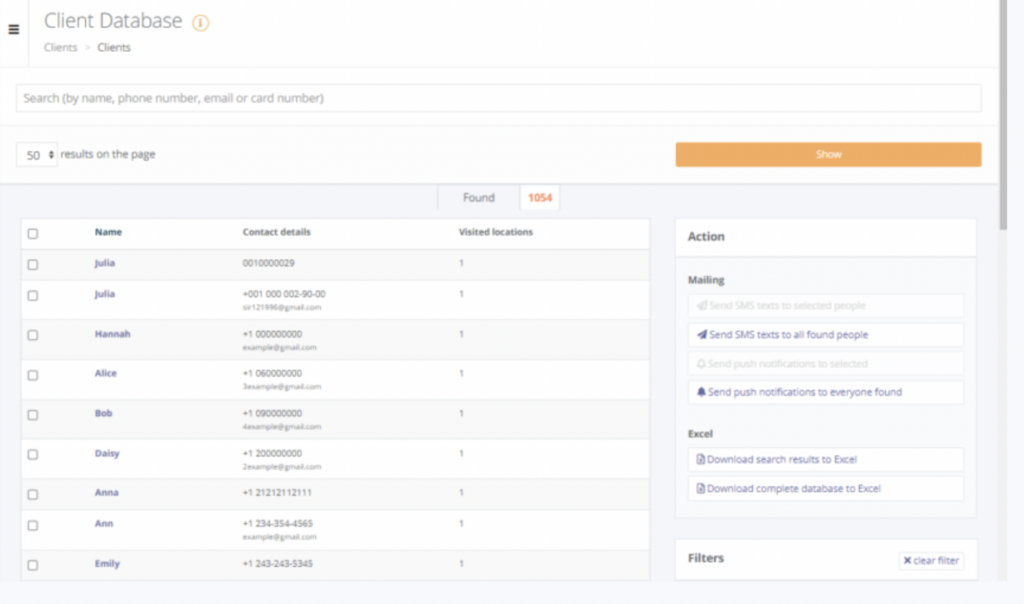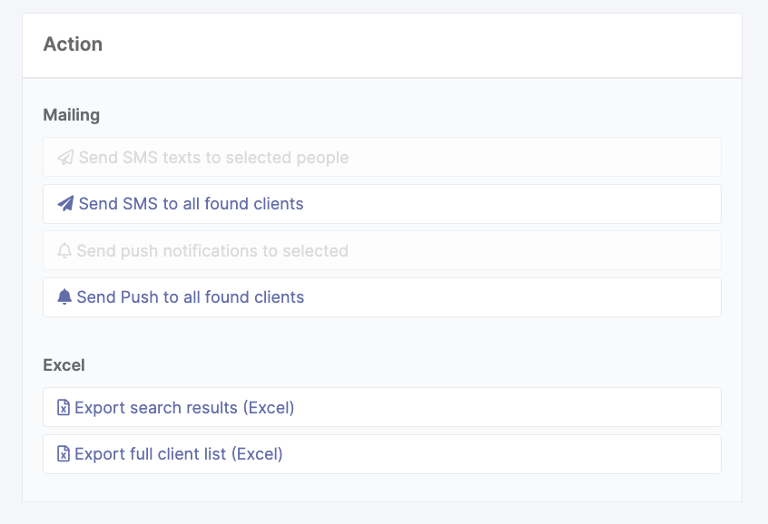 You can send mass newsletter to customers and download data to Excel. To do this, use the Action block in the Clients section.