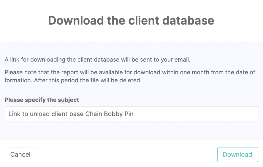 The client database can only be downloaded via email. Users receive an email with a link to the downloaded file to the email address specified in their personal account. Please note that the download link sent to the email will be valid for one month from the date of creation. After this period, the file will be deleted.