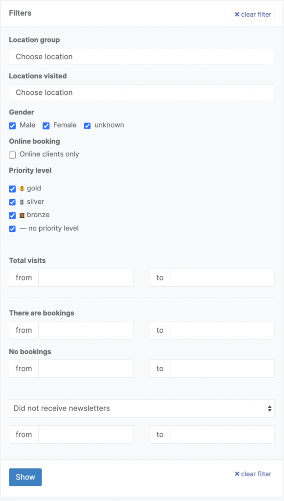 Filter the customer data by the required items, click Show. To remove the filters, click Clear filter.