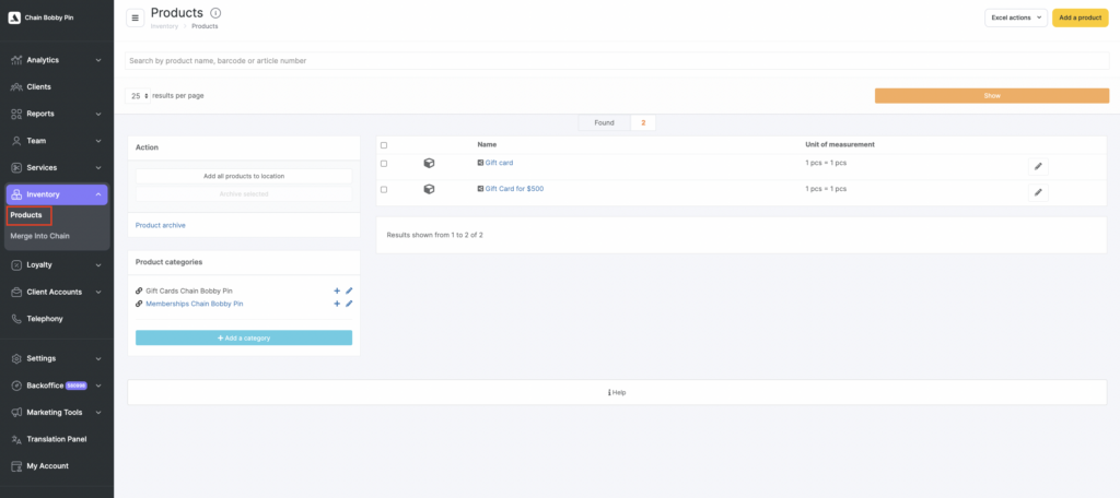 - To get started, go to the Inventory > Products section in the main menu of the chain interface. Before adding products to the inventory, create and set Categories of products.