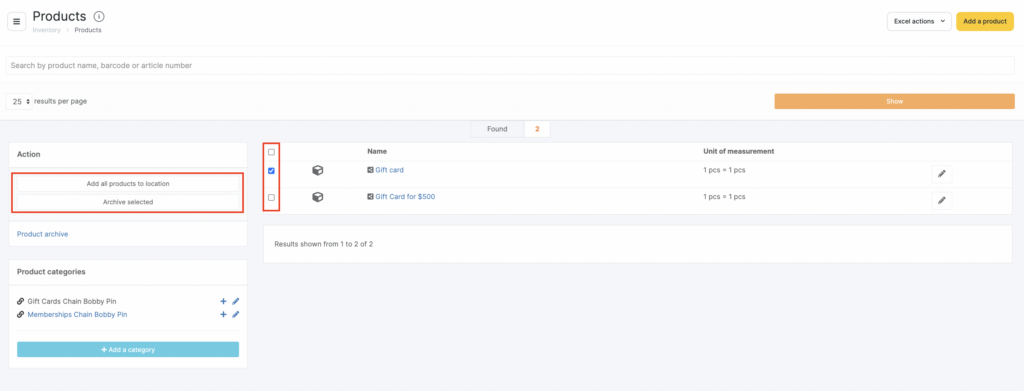 You can also transfer products from the location to the chain on a mass scale. To do this, go to the Inventory > Products, select the necessary products (check the box next to the name) and click Add all products to location. In the pop-up window select the location and click Add.
