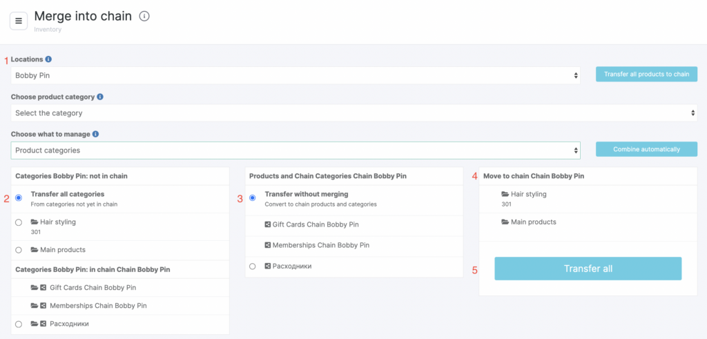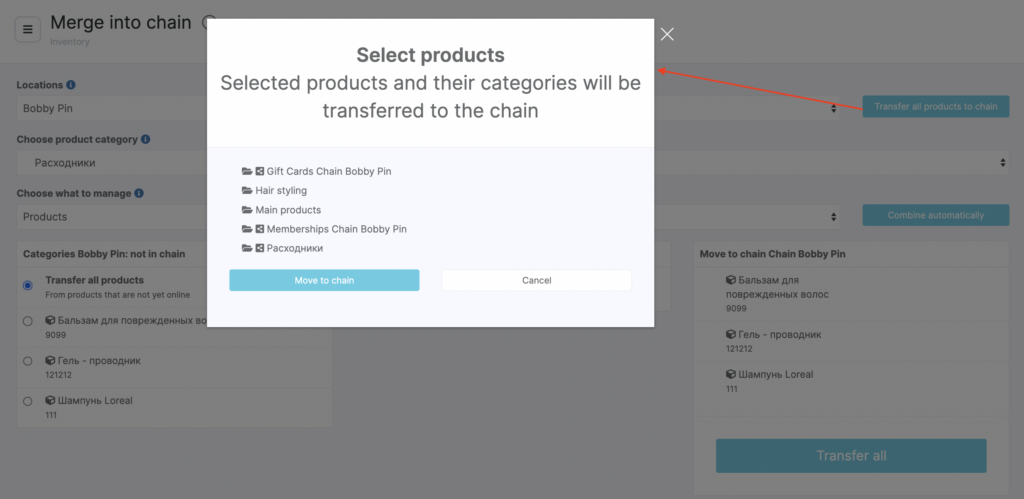 You can also transfer products from the location to the chain on a mass scale. To do this, go to the Inventory > Merge into chain section, select the location where you want to transfer the products from, and click Transfer all products to the chain.