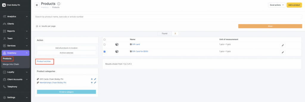 Archived products will be located in the chain interface in the Inventory > Products section.