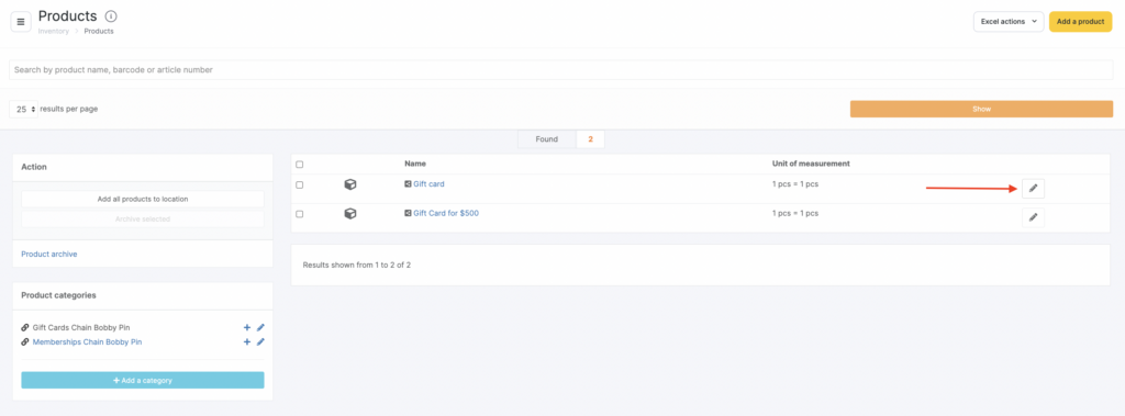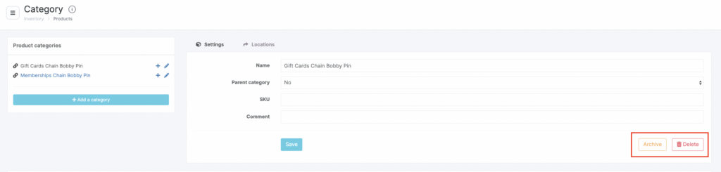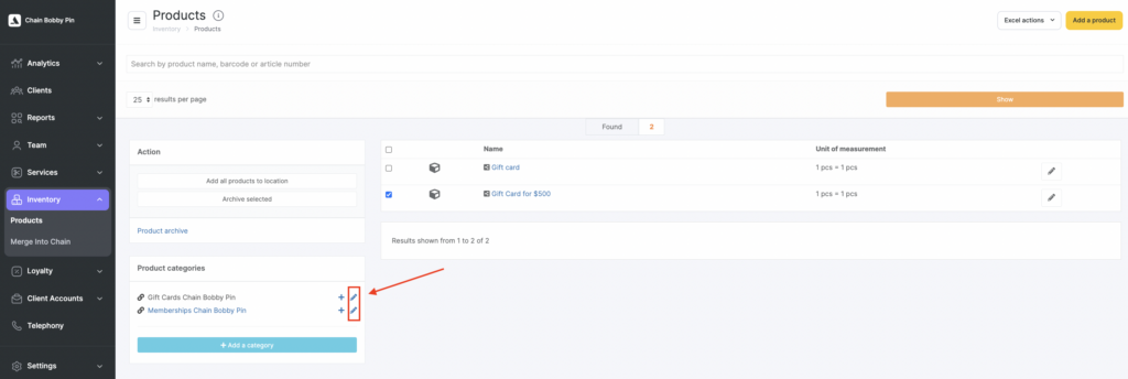 • To archive a category of products, go to the chain interface (Inventory — Products section) and start editing the required category.