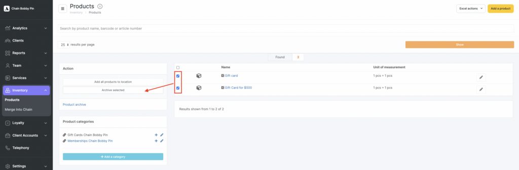 • You can archive several products at once. Select the desired category, check the boxes next to the product names, click the Archive selected button.