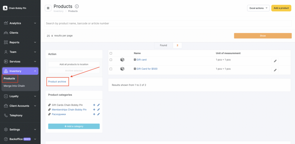 - Archiving products in the chain allows you to hide products list in the interface, clean the product list in all locations where the product was added, and at the same time save statistics in reports.