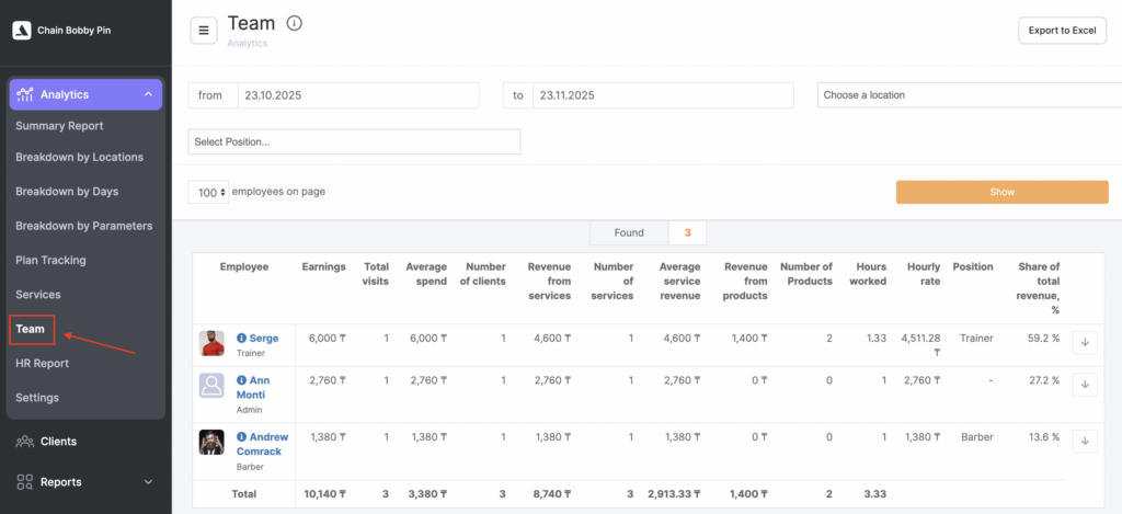 The Analytics → Team section shows how much revenue each team member generates over a selected period and across which key indicators.