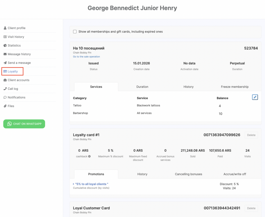 You can view the history for accrual/debiting and bonuses cancellation dates as well as write off and accrue additional bonuses in the client’s card in the Clients > All Clients section in each card or in the Loyalty tab in the visit.