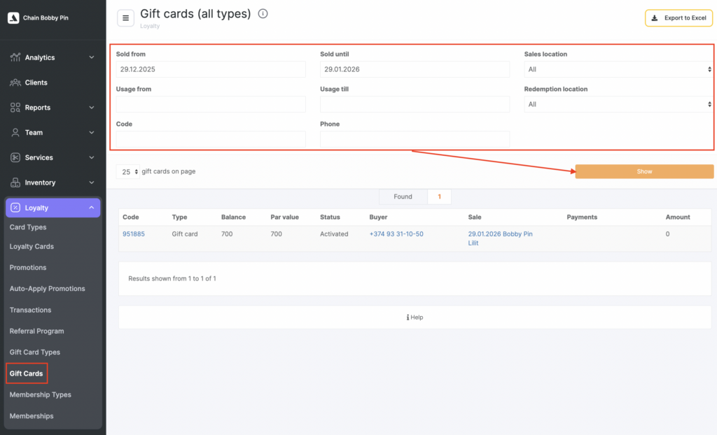 Using filters you can view a number of gift cards sold in a specific location for a period selected.