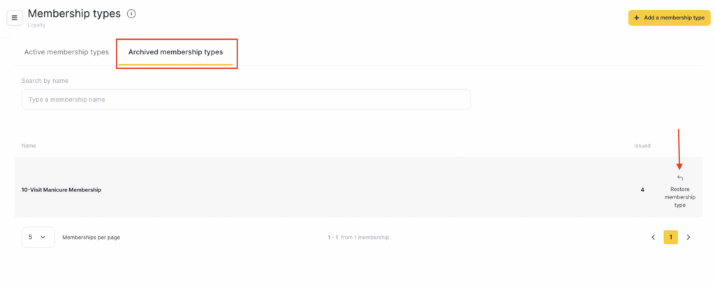 - To restore the membership go to the Archive of membership types tab and click the action button on the right of the membership name.