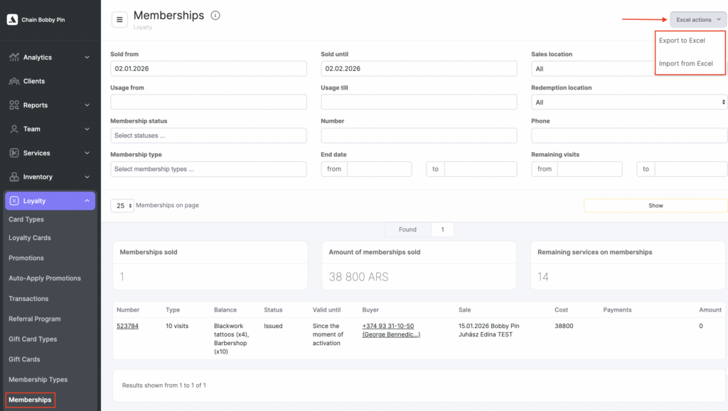 To upload memberships from Excel go to the chain interface, open Loyalty > Memberships section and click the Import from Excel button.