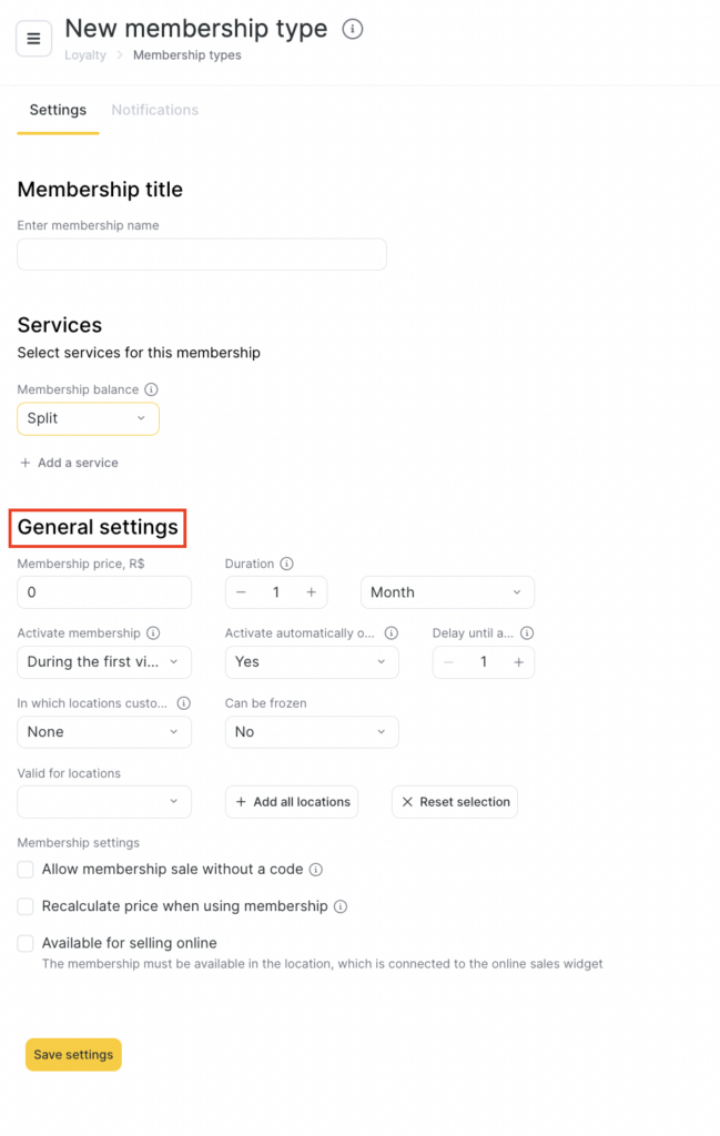 To set up notifications, go to Loyalty > Membership types in the chain interface, select the required membership type, and open the Notifications tab.