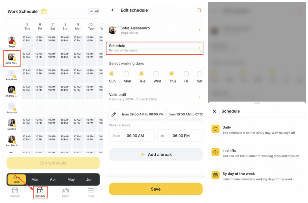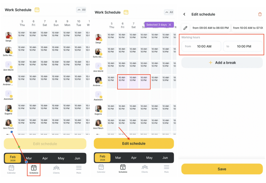 In the mobile app, you can set a schedule for multiple team members at once or individually for each person. Bulk scheduling is useful when several team members work the same hours.