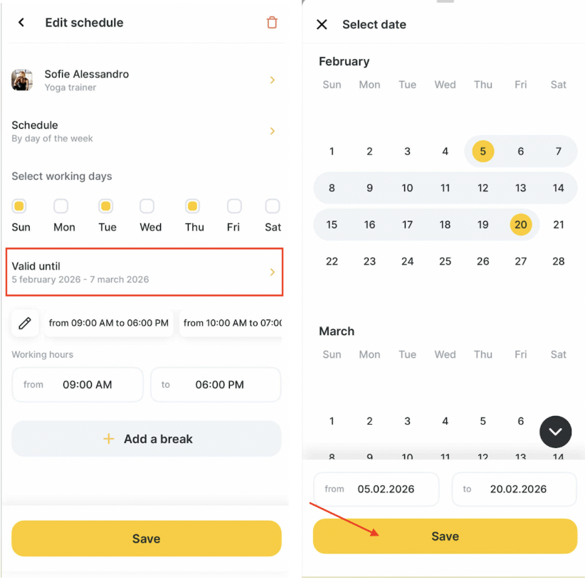 - In the Valid until field, select the start and end dates of the schedule in the calendar, then tap Save.