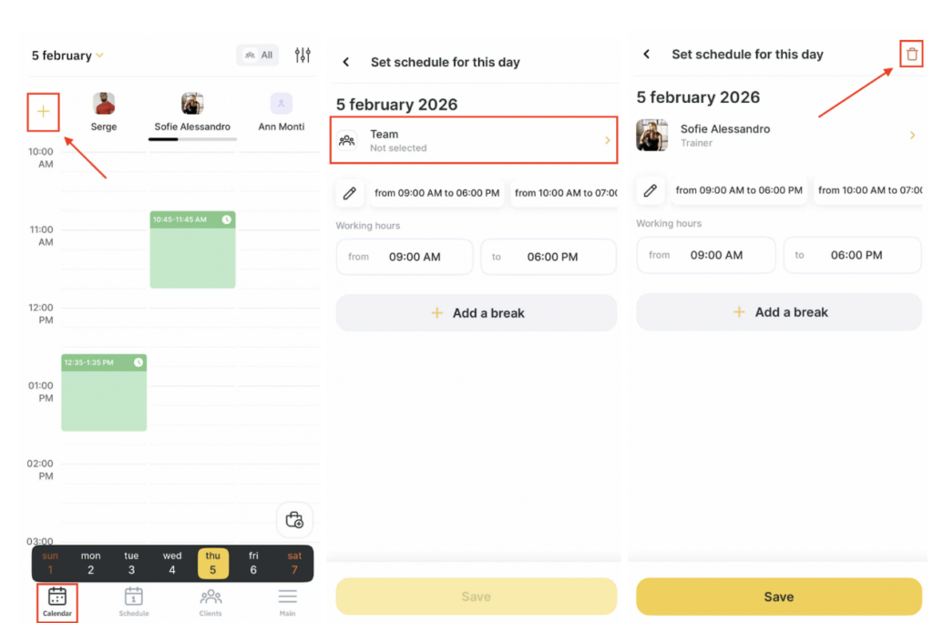 - Remove from schedule for the day: a message appears: “Remove from the schedule for the selected day?” Tap Yes to remove the team member from the schedule for that day.