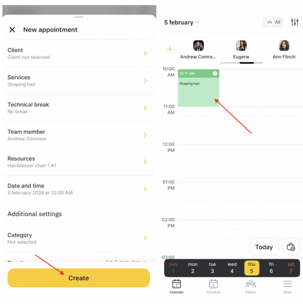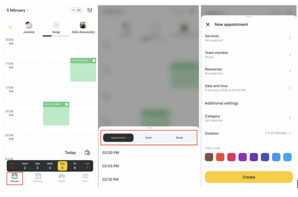 - Select a team member and time, tap an empty slot, and in the pop-up window choose the exact time for the appointment.
