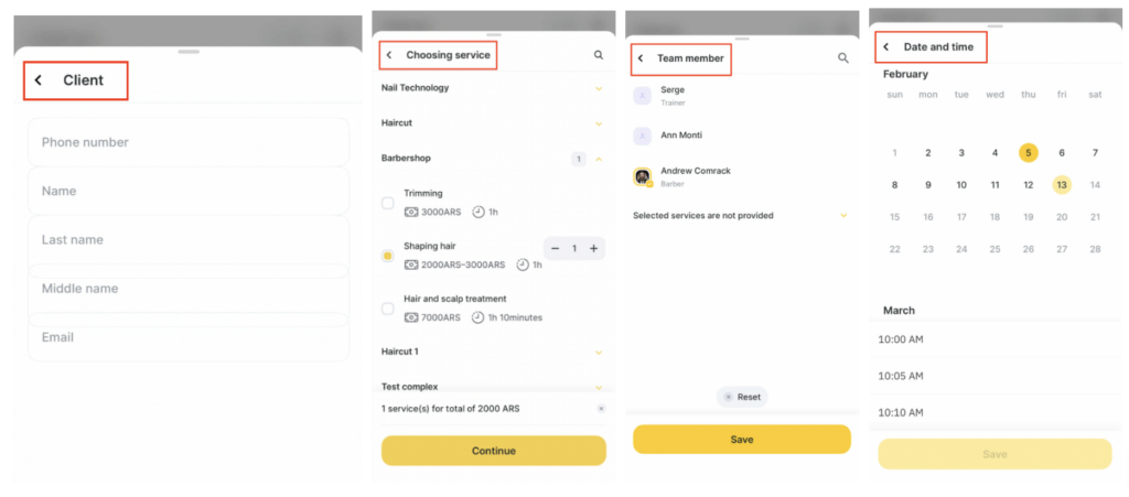 - Select a client. If the client is new, enter their phone number, name, email, and tap Continue. If the client already exists in the client database, select them from the list.