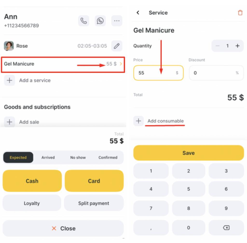 - If necessary, change the service price, add a discount, consumable or change the quantity. To do this, click the service name in the visit.