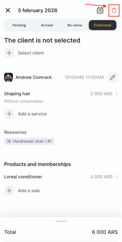 - To delete a service from the appointment, click the trash icon in the upper right corner.